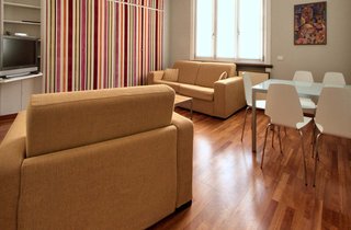 Sie kann mit dem benachbarten Wohnung 402-Savoia vereint werden um so eine große Vier-Zimmer-Wohnung mit zwei Bädern zu bilden, die bis zu zehn Personen Platz bietet.