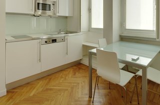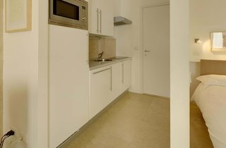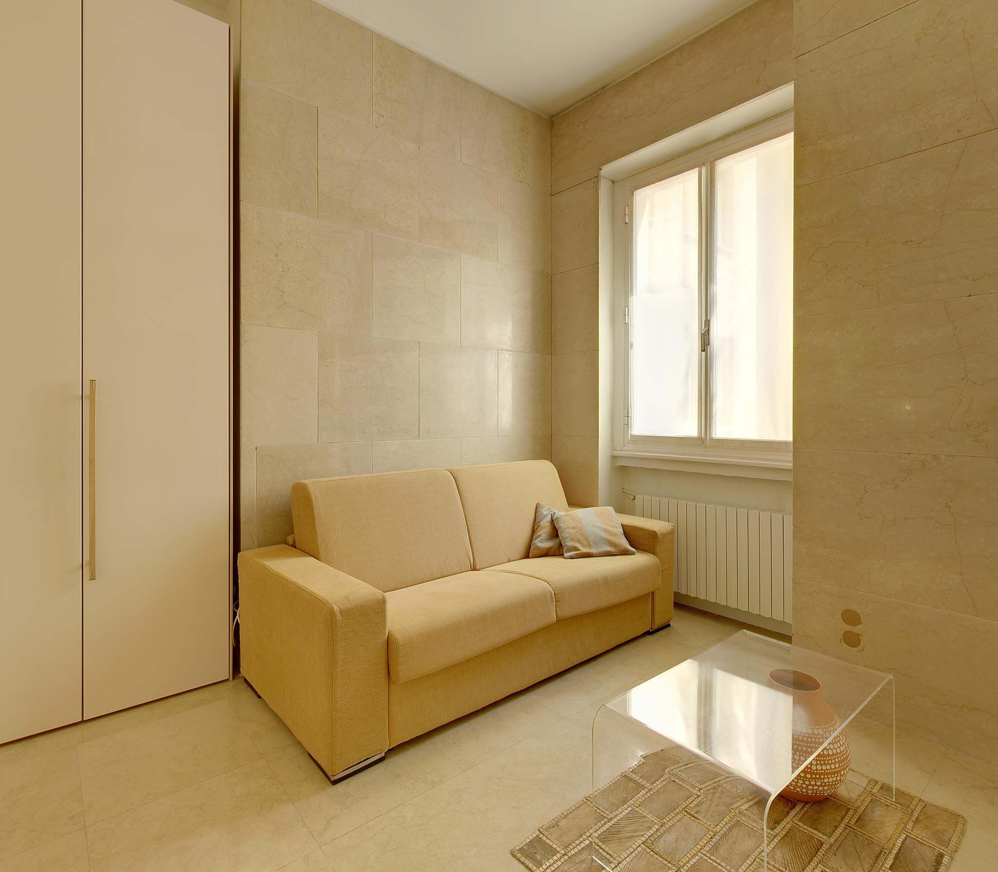 Wir bieten eine große Auswahl von Einzimmerwohnungen zur Miete an, richtige Apartments mehr geräumig als Residenz- oder Hotelzimmer, elegant eingerichtet und ausgestattet mit allen Annehmlichkeiten. Unsere Studio-Apartments sind 30 Quadratmeter groß und sind mit einem Doppelbett und einer Ausziehcouch ausgestattet. Sie sind mit qualitativ hochwertiger Baumwollbettwäsche, Daunenkissen und Bettdecke und mit einem großzügigen Schrank eingerichtet. Sie bieten WiFi, digitales italienisches Fernsehen und optional international Satelliten-Programmierung und DVD-Player. Die Küche verfügt über Doppel-Herd, Mikrowelle, Wasserkocher, Toaster mit Töpfen, Küchenutensilien, Geschirr, Gläser, Besteck und einen Tisch mit Stühlen. Die Studios verfügen über Zentralheizung, Klimaanlage, Spülmaschine, Waschmaschine, Dampfbügeleisen und Bügelbrett. Das Badezimmer hat eine Dusche, WC, Bidet, Waschbecken mit Spiegel und Steckdose für elektrischen Rasierer und Haartrockner.