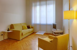Dies ist eine elegante und geräumige Zweizimmerwohnung, in einem modernen Stil mit einem Doppelbett im Schlafzimmer und einer Doppelausziehcouch im Wohnzimmer ausgestattet. Sie verfügt im Wohnzimmer außerdem über einen Sessel und einer Küchenzeile mit einem Tisch und Stühlen. Fußböden in den Zimmern sind im traditionellen Parkett mit im Bad aus Carrara-Marmor.