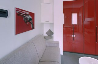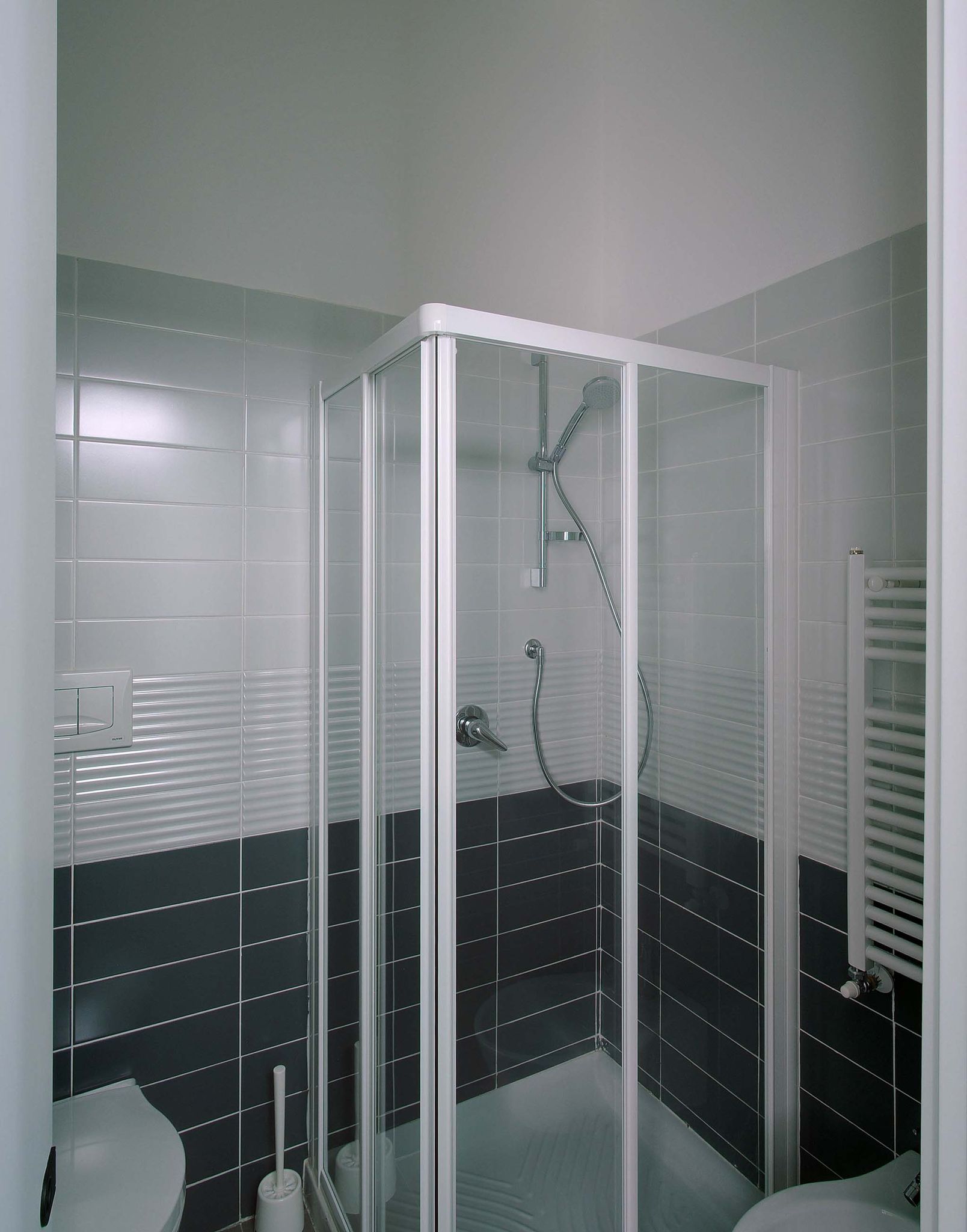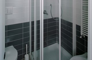Monolocale arredato in stile contemporaneo con un letto matrimoniale e di un divano letto. Dispone di un’ampia sala con cucina americana, tavolo con sedie, zona relax e zona notte. I pavimenti sono rivestiti con grandi lastre di gres porcellanato grigio. Il bagno con doccia è rivestito con una piastrellatura moderna.